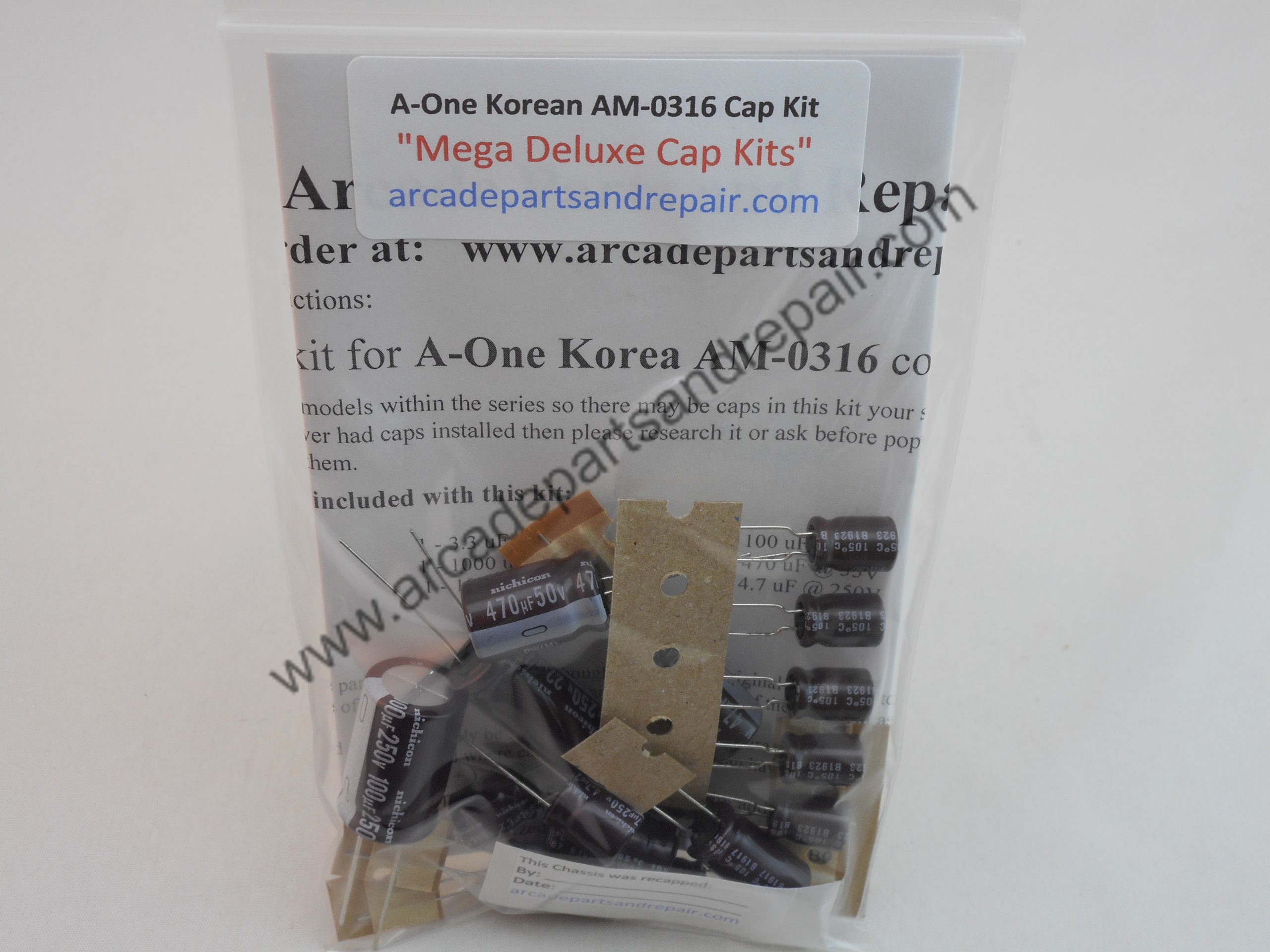 A-One AM-0316 Korean Series arcade Monitor Cap Kit 105C 100% Nichicon Capacitors. 18 Capacitors total which includes 1 Bi-Polar capacitor and with great instructions. “Mega Deluxe Cap Kits” Our kits have some of the BEST quality, low ESR, and longest life capacitors included. All of our Cap Kits / Get Well Kits include a sticker so you can place it on the monitor to help you keep track of the work you did and when it was done. NOTE: The Filter cap for this chassis is a 680uf 250v and is not included in the kit but it can be purchased separately on our site.