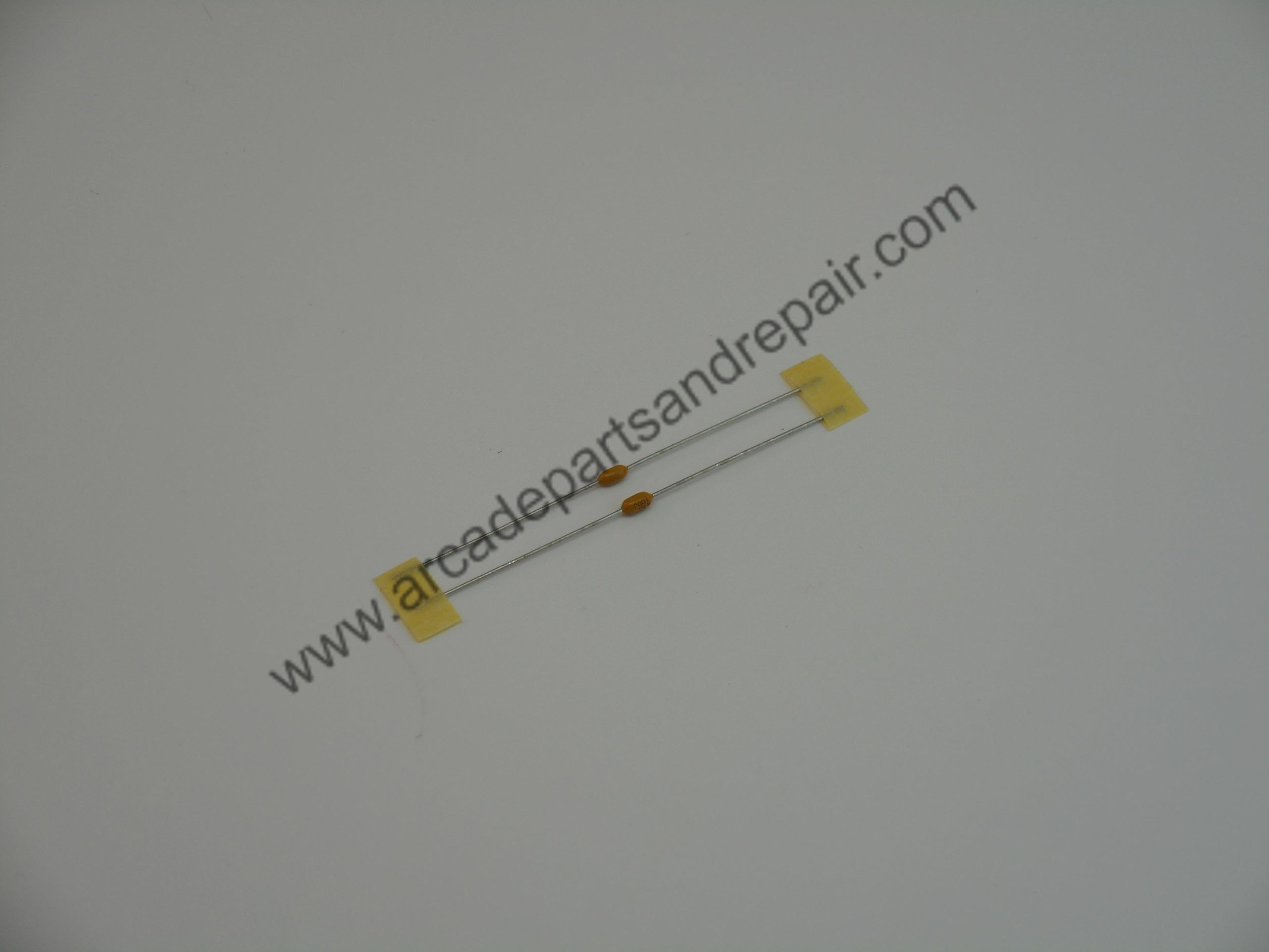 10pF 100V 5% tolerance MLCC Axial Capacitor (2 Pieces) (MC1069) (0.01nF) (0.00001uF).  Conformally Coated, C0G Dielectric Aximax conformally coated axial leaded ceramic capacitors in C0G dielectric feature a 125°C maximum operating temperature.  These are used on many arcade and pinball PCBs.  This is used on the Atari San Francisco Rush the Rock CPU U17 heatsink Field Service Bulletin:  It has come to our attention that some SF Rush the Rock CPU boards (A-21937) may exhibit a reset problem.  Symptoms are: the game freezes then re-boots during game play.  To fix this timing error, solder this 10pF axial capacitor (5048-12503-00) from the load side of R571 to the ground side of C310.  See attached image for an exploded view of the exact location on the board of the added capacitor.  For every quantity of 1 added to your cart you will receive 2 capacitors.