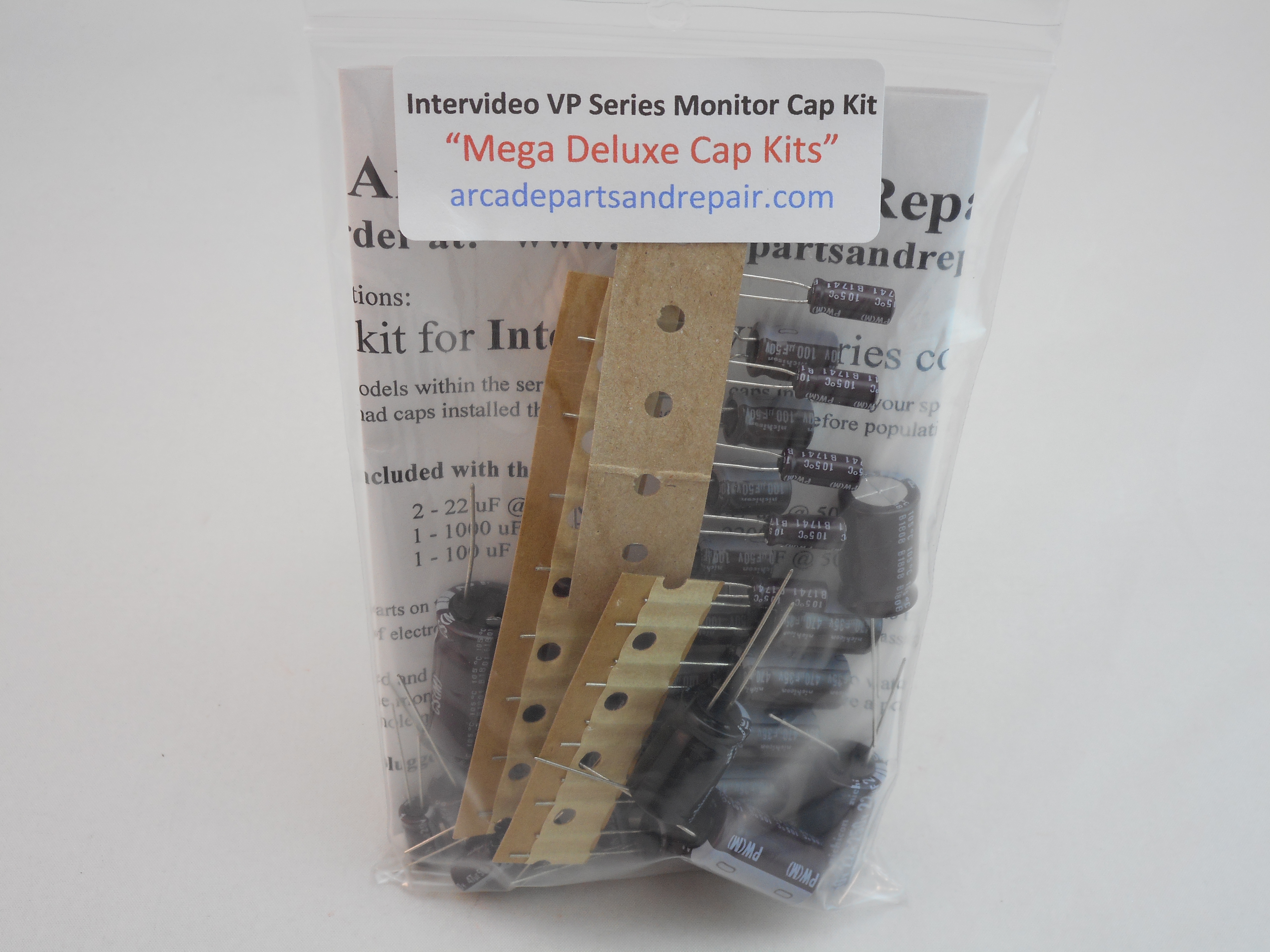 Intervideo VP Series arcade Monitor Cap Kit 105C 100% Nichicon capacitors. “Mega Deluxe Cap Kits” Our kits have some of the BEST quality, low ESR, and longest life capacitors included. This kit should fit all sizes and versions of the VP series chassis so not all chassis versions will use all the capacitors included in this kit. All of our Cap Kits / Get Well Kits include a sticker so you can place it on the monitor to help you keep track of the work you did and when it was done. 38 capacitors included in kit along with great instructions. NOTE: Filter cap for the 220v chassis is a 150uf 385v but you can replace it with the 220uf 400v filter cap on our site and if you have a 110v version of this chassis it takes two 470uf 250v (must use the 22mm diameter 470uf 250v capacitors on our site) and these are not included in kit but can be purchased separately on our site.