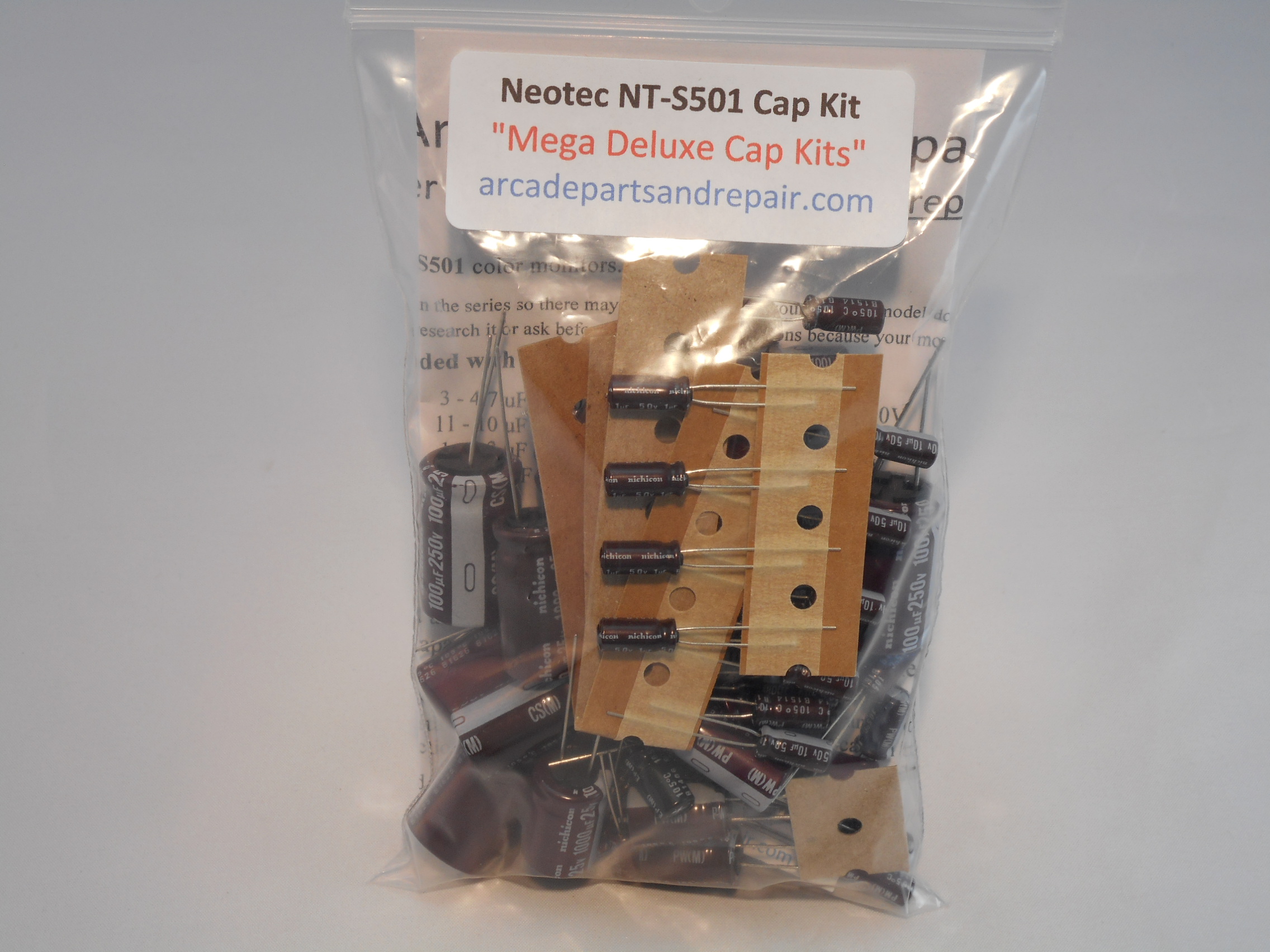 Neotec NT-S501 arcade Monitor Cap Kit 105C and 100% Nichicon capacitors. “Mega Deluxe Cap Kits” This kit will also work for the NT-S500 monitor chassis. 57 Capacitors in the kit including Bi-Polar capacitor. Our kits have some of the BEST quality, low ESR, and longest life capacitors included. All of our Cap Kits / Get Well Kits include a sticker so you can place it on the monitor to help you keep track of the work you did and when it was done. Excellent instructions included that also cover all this chassis screen printed errors to help you. NOTE: We have seen some chassis labeled with NT-2500S which the ones we have seen use this NT-S501 kit and not the NT-2500 kit. NOTE: Filter cap for this chassis is a 330uf 400v and is not included in kit but can be purchased separately on our site.