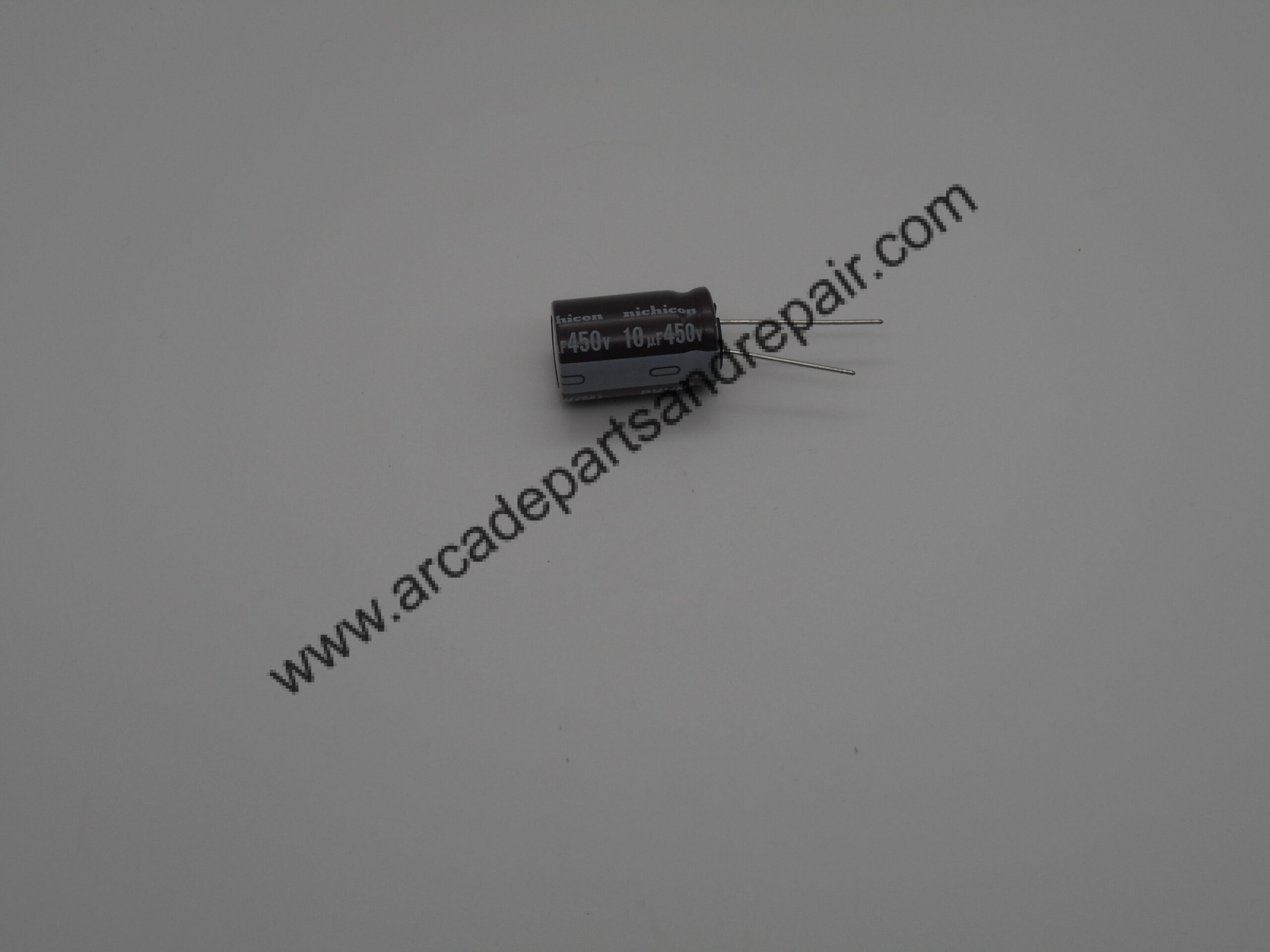 10 uF 450V radial High Ripple Current, Low Impedance, high reliability and Long Life 105C Electrolytic Nichicon Capacitor.  Case size is 16mm diameter, 25mm length, 7.5mm lead spacing, 75mA Ripple current and 8000 hour endurance.  These are found in many switching power supplies, monitors and anything else that needs this size and value of capacitor.