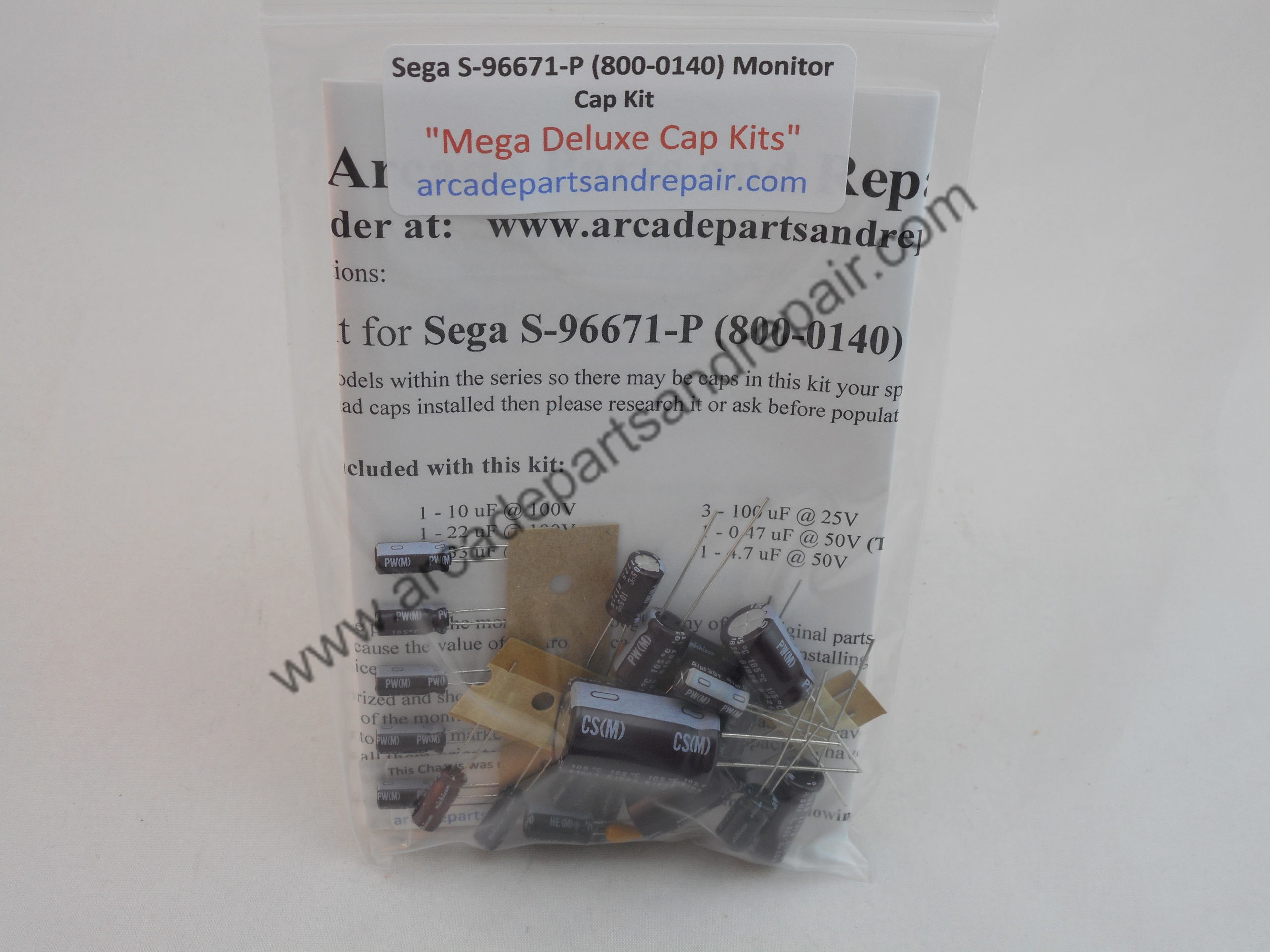 Sega S-96671-P / 800-0140 arcade Monitor Cap Kit 105C 100% Nichicon capacitors. “Mega Deluxe Cap Kits” Our kits have some of the BEST quality, low ESR, and longest life capacitors included. This monitor is found in game such as Frogger and Astro Blaster and others. Here are some numbers found on the main PCB to help ID this chassis PW8F0830CE, K0830DE and the flyback usually has F1158CE-S and the Tube usually is a Sharp 510UEB22. All of our Cap Kits / Get Well Kits include a sticker so you can place it on the monitor to help you keep track of the work you did and when it was done. 21 capacitors included in kit along with great instructions. NOTE: The Filter cap for this chassis is a 680uf 250v and is not included in the kit but can be purchased separately on our site.