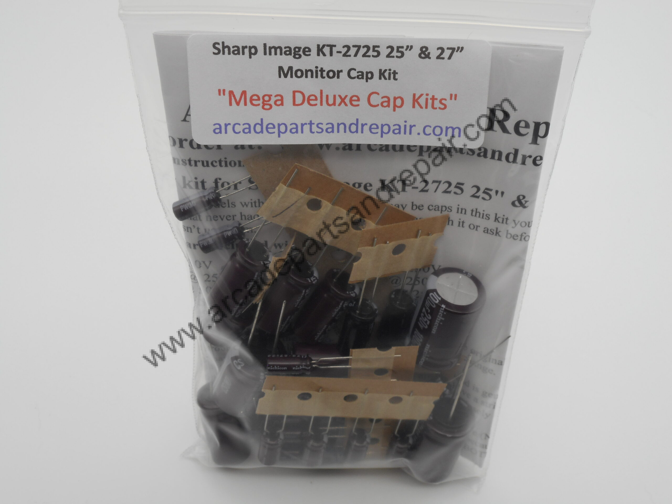Sharp Image KT-2725 25 inch & 27 inch Arcade Monitor Cap Kit 105C 100% Nichicon Capacitors. “Mega Deluxe Cap Kits” Our kits have some of the BEST quality, low ESR, and longest life capacitors included. Some PCB marks can be on the neck PCB are KT-2725C or on the main pcb are KT-2725-891027 and remote PCB KT2725XS 891027. All of our Cap Kits / Get Well Kits include a sticker so you can place it on the monitor to help you keep track of the work you did and when it was done. 35 Capacitors included in this kit and comes with great instructions. NOTE: Filter cap for this chassis is a 680uf 250v and is not included in kit but can be purchased separately on our site.