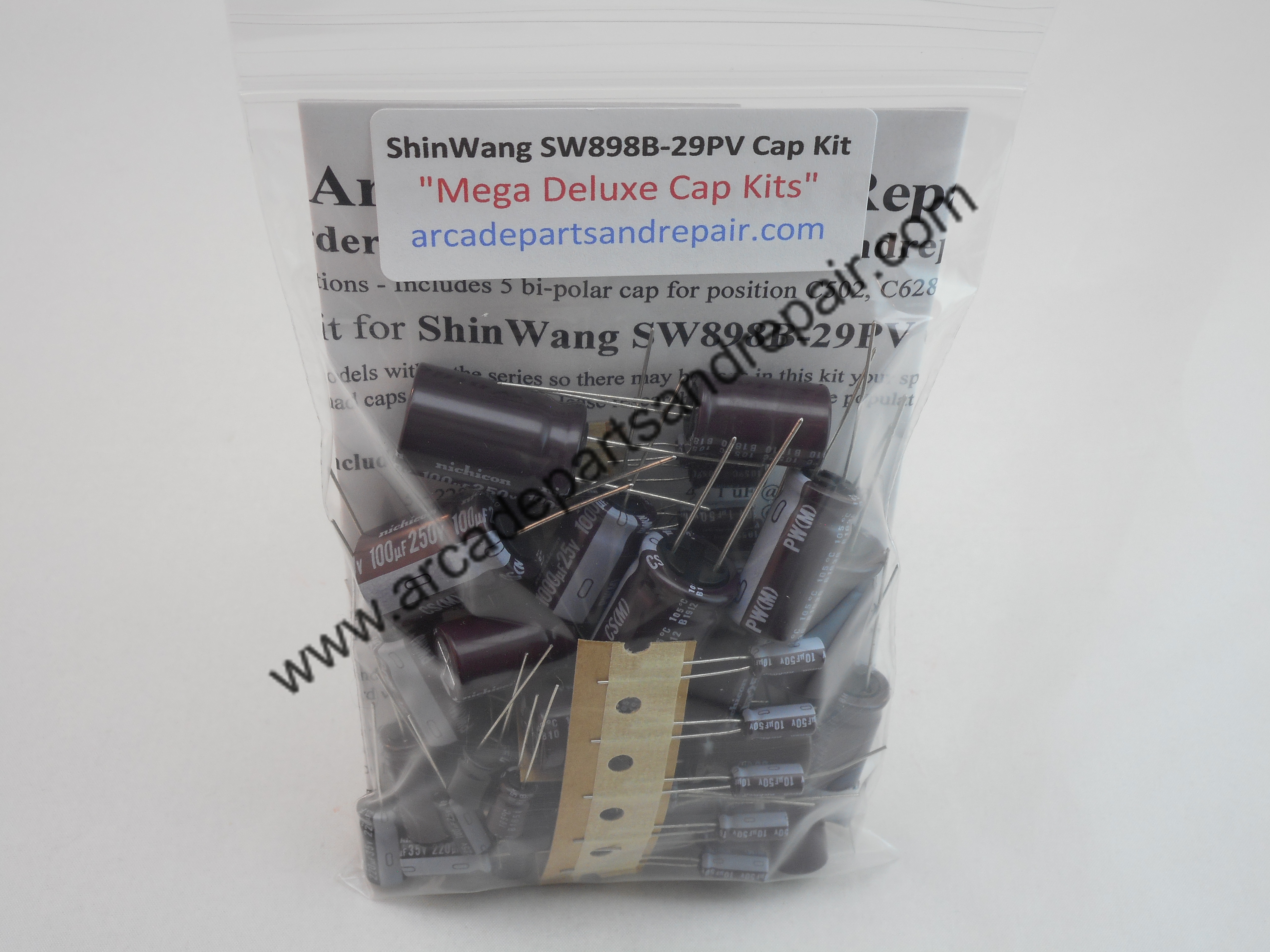ShinWang SW898B-29PV Arcade Monitor Cap Kit 105C 100% Nichicon Capacitors. “Mega Deluxe Cap Kits” Our kits have some of the BEST quality, low ESR, and longest life capacitors included. All of our Cap Kits / Get Well Kits include a sticker so you can place it on the monitor to help you keep track of the work you did and when it was done. This monitor is commonly found in Percussion Master arcade games and others. 62 Capacitors total including the 5 Bi-Polar caps. Includes Bi-Polar capacitors for C502, C628, C827, C828 and C829. NO OTHER VENDORS MAKE THIS KIT WITH C502, C827, C828 and C829 1uF 400v NP INCLUDED EXCEPT HERE AT ARCADE PARTS AND REPAIR. C502, C827, C828 and C829 are a 105c Non-Polar capacitor but is not a Nichicon since they don’t make this capacitor and we had them made for this application. Excellent instructions included. NOTE: Filter cap for this chassis is a 330uf 400v and is not included in kit but can be purchased separately on our site.
