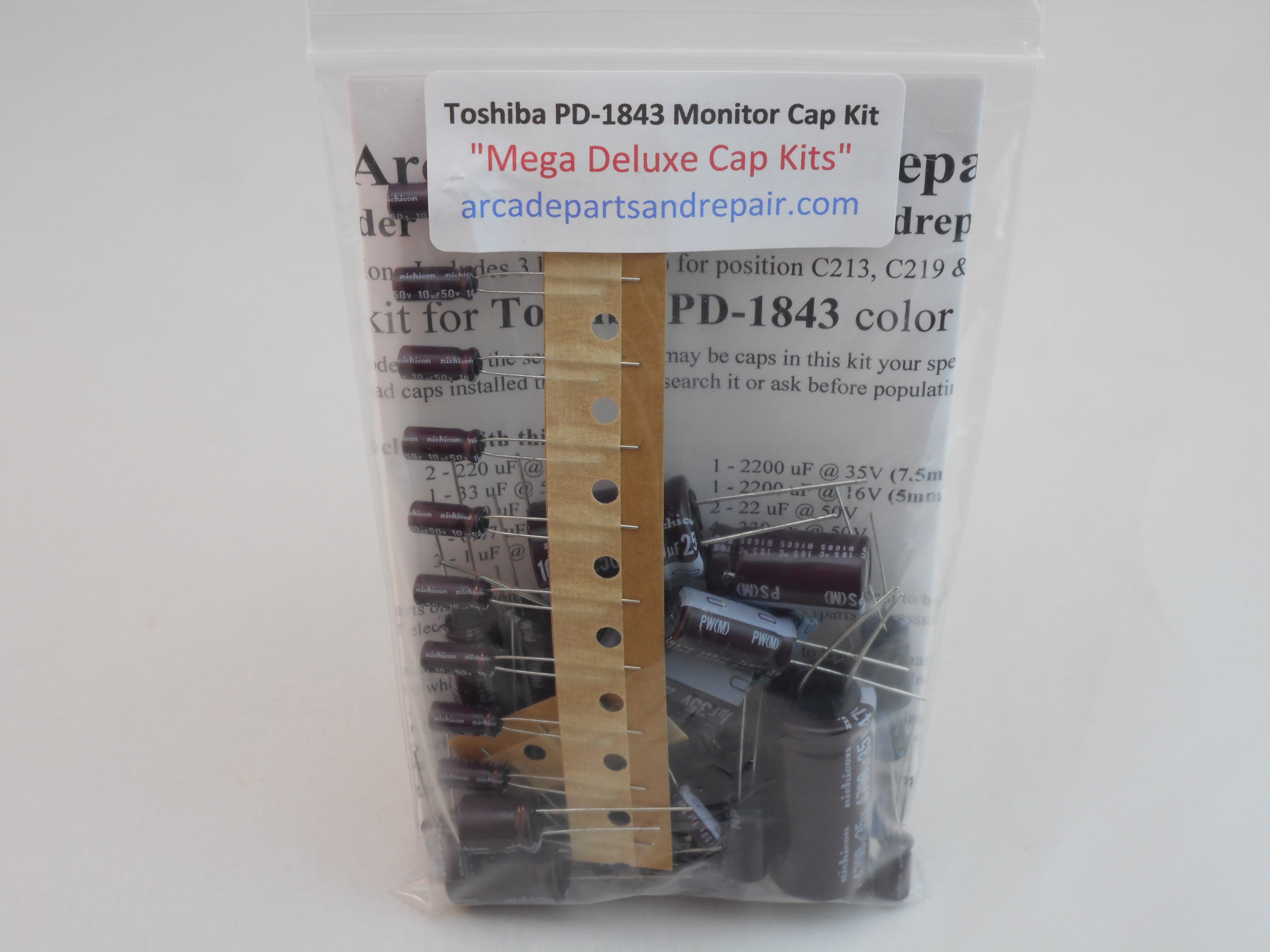 Toshiba PD1843 Arcade Monitor Cap Kit 105C 100% Nichicon Capacitors. This kit also works for PD1843 Revision G and all other revisions. “Mega Deluxe Cap Kits” Our kits have some of the BEST quality, low ESR, and longest life capacitors included. All of our Cap Kits / Get Well Kits include a sticker so you can place it on the monitor to help you keep track of the work you did and when it was done. This monitor is usually found in Platinum New Net City, Egret 3 Tosh and others and has markings on the PCB of 23590055B and sometimes models listed on frame of D29C255. 45 Capacitors total including the 3 Bi-Polar caps. Includes Bi-Polar capacitors for C213, C219 and C225. NO OTHER VENDORS MAKE THIS KIT WITH C213, C219 and C225 1uF 400v NP INCLUDED EXCEPT HERE AT ARCADE PARTS AND REPAIR. C213, C219 and C225 are a 105c Non-Polar capacitor but are not Nichicon since they don’t make this capacitor and we had them made for this application. Excellent instructions included. NOTE: There are Three Filter caps for this chassis which two are 220uf 200v and one 1000uf 250v and they are not included in the kit but can be purchased separately on our site.