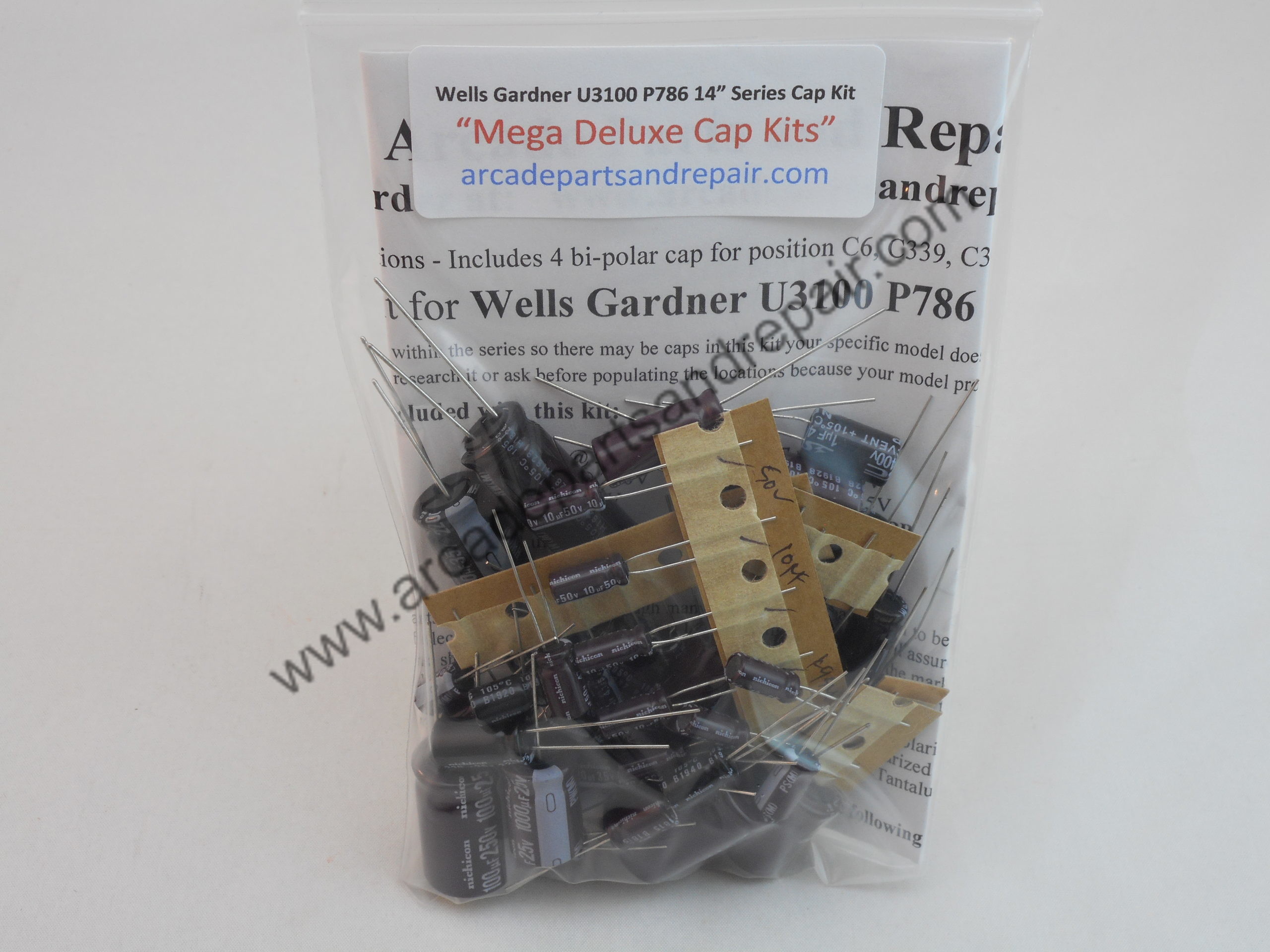 Wells Gardner U3100 14″ P786 arcade monitor Cap Kit 105C 100% Nichicon Capacitors “Mega Deluxe Cap Kits” and the Kit includes 47 Capacitors total which includes 4 Bi-Polar caps. Wells Gardner U3100 14 inch with P786 (054A3101-013) main chassis and P831 (054A0831-001) Neck PCB. Our kits have some of the BEST quality, low ESR, and longest life capacitors included. NO OTHER VENDORS MAKES THIS KIT WITH C339, C340, and C341 1uF 400v NP CAPS INCLUDED EXCEPT HERE AT ARCADE PARTS AND REPAIR. C339, C340, and C341 are 105c Non-Polar / Bi-Polar capacitors but are not Nichicon since they don’t make this capacitor and we had them made for this application. All of our Cap Kits / Get Well Kits include a sticker so you can place it on the monitor to help you keep track of the work you did and when it was done. Great instructions included with every kit. NOTE: The Filter cap for this chassis is a 330uf 400v and is not included in the kit but can be purchased separately on our site.