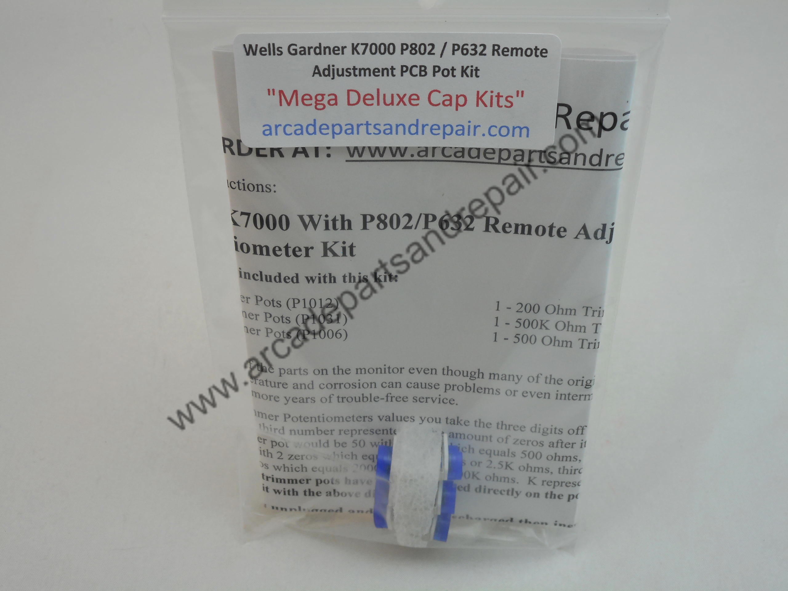 Wells Gardner K7000 Arcade P802 / P632 Remote Adjustment PCB Trimmer Pot Kit. 1/2 Watt 25% Cermet TRIMMER POTENTIOMETER. The original pots were rated at 0.30W so these are much higher rated than original and don’t buy those garbage kits that other vendors sell that have 0.15W pots in them which are very much underrated. Horizontal mount top adjust POT, 0.50 Watt with PCB layout of 5mm x 10mm. This kit has all the correct fitting 10mm x 5mm Pots and ALL the correct values and these are all brand new and not old stock. This kit includes pots for VR101 (Contrast), VR102 (Black Level), VR103 (Vertical Position), VR104 (Vertical Size), VR105 (Vertical Hold), VR106 (Horizontal Position). 6 Trimmer pots included in kit along with great instructions.