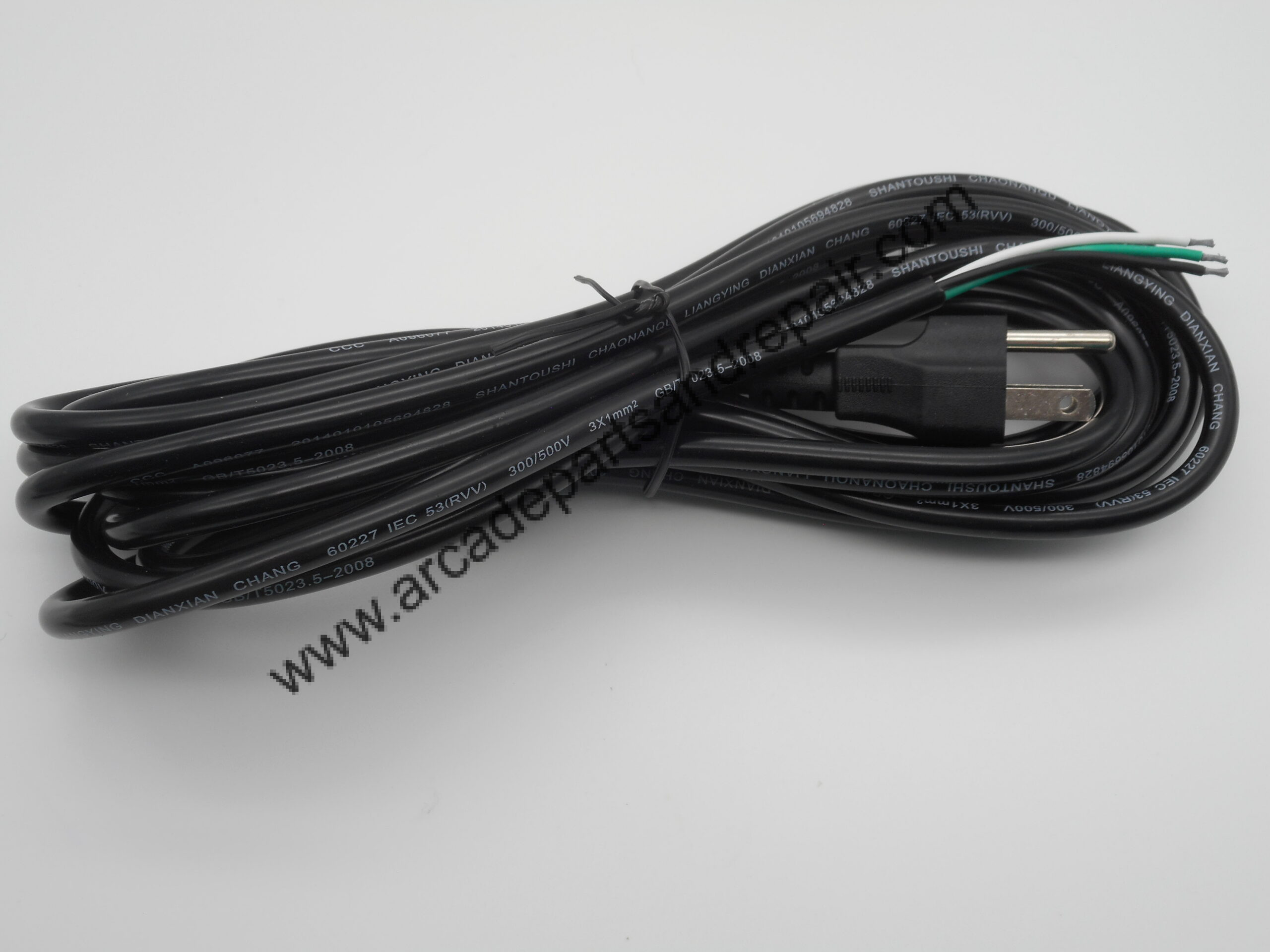 15 Ft. AC Power line cord with NEMA 5-15P (Wall Socket Plug) on one end and stripped wire leads on the other end (CS1016).  Round Black cord, 15 feet long and is 18/3 AWG wire gauge with 10 amp capacity.  This 15 Foot long cord is perfect for replacing damaged or too short of power cords on all Pinball, Arcade and other amusement games.