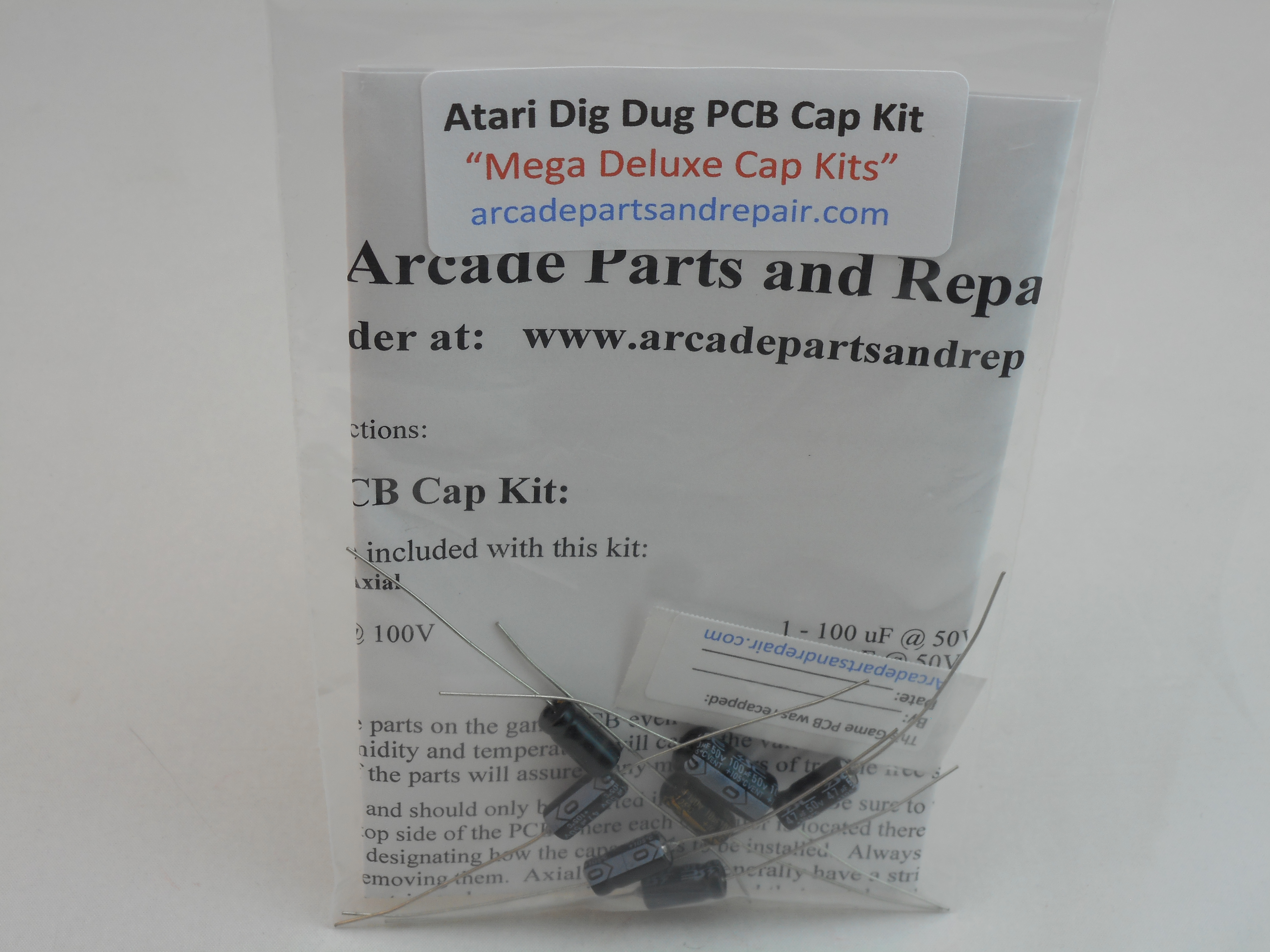 Atari Dig Dug arcade game PCB Complete Axial 105C Cap Kit.  “Mega Deluxe Cap Kits”  Our kits have some of the BEST quality, low ESR, and longest life capacitors included.  All of our Cap Kits / Get Well Kits include a sticker so you can place it on the PCB to help you keep track of the work you did and when it was done.   The kit has a total of 7 axial capacitors and great instructions.  NOTE: This kit is for the Atari Dig Dug and not the Namco Dig Dug game PCB.