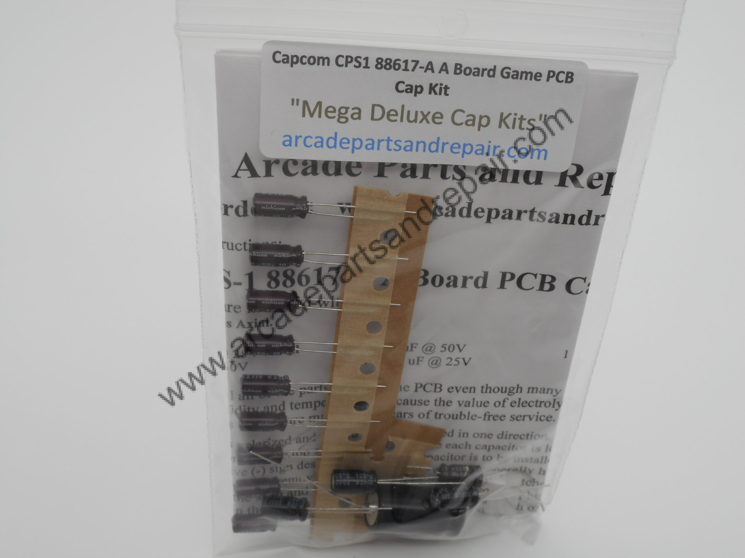 Capcom CPS-1 88617A A Board Arcade Game PCB 105C Cap Kit. This Capcom CPS1 cap kit works on all arcade games that use the 88617-A PCB such as Cadillacs and Dinosaurs, Capcom World 2, Captain Commando, Carrier Air Wing, Dynasty Wars, Final Fight, Forgotten Worlds, Ganbare Marin-kun, Ghouls ‘n Ghosts, Ken Sei Mogura, Knights of the Round, Magic Sword: Heroic Fantasy, Mega Man – the Power Battle, Mega Twins, Mercs, Muscle Bomber Duo – Ultimate Team Battle, Nemo, Pang! 3, Pnickies, Quiz & Dragons: Capcom Quiz Game, Quiz Tonosama no Yabou 2: Zenkoku-ban, Saturday Night Slam Masters, Street Fighter II Turbo: Hyper Fighting, Street Fighter II: Champion Edition, Street Fighter II: The World Warrior, Street Fighter Zero – CPS Changer, Strider, The King Of Dragons, The Punisher, Three Wonders, U.N. Squadron, Varth: Operation Thunderstorm, Warriors of Fate, Willow. “Mega Deluxe Cap Kit” All capacitors are 105c including the Axial caps in this kit and they are all at least 11mm tall. All of our Cap Kits / Get Well Kits include a sticker so you can place it on the PCB to help you keep track of the work you did and when it was done. 16 Capacitors total included in kit with great instructions. Our kits have some of the BEST quality, low ESR, and longest life capacitors in them.