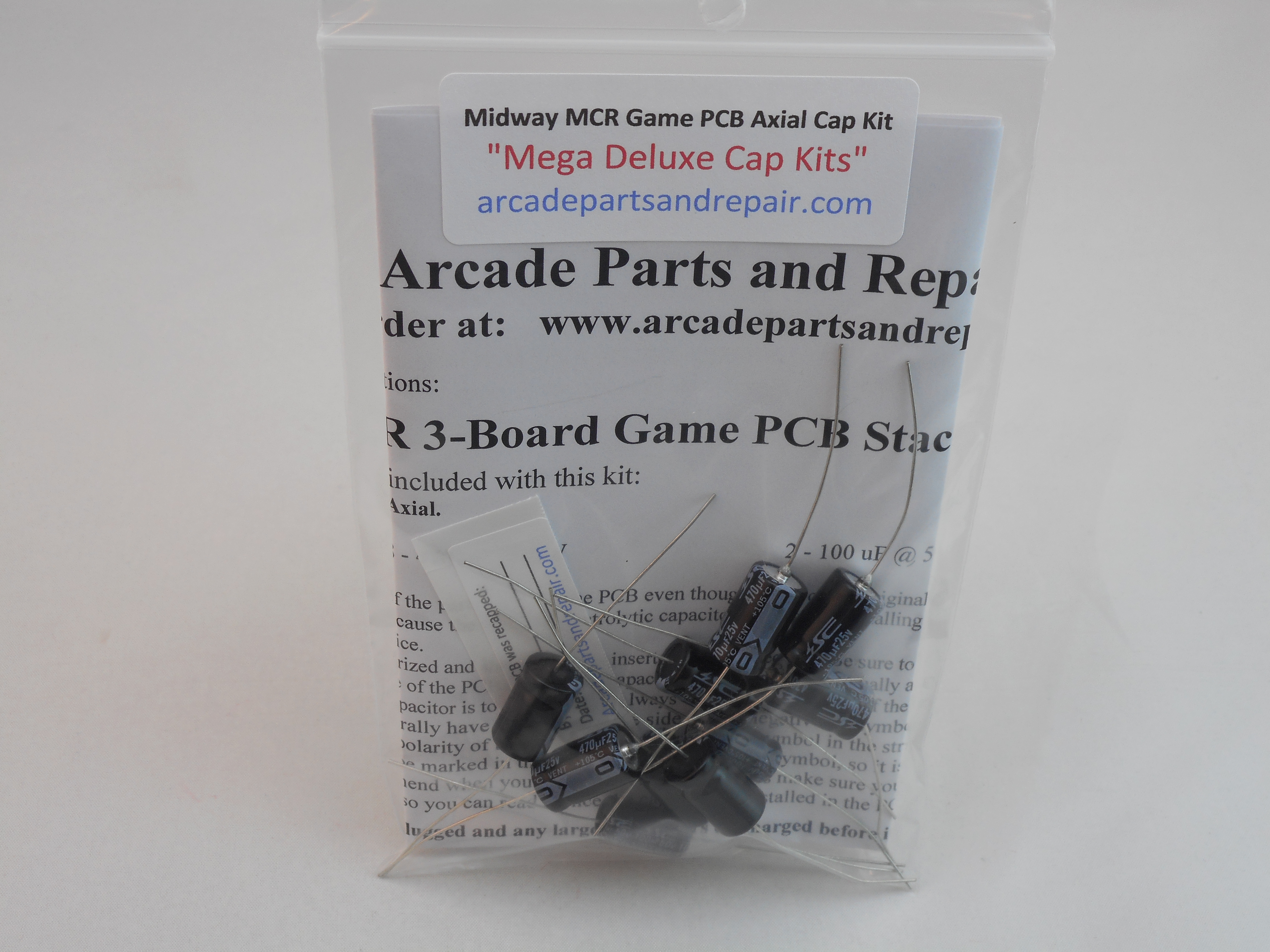 Midway MCR 3-Board Game PCB stack 105C Axial Cap Kit is the only 105C axial cap kit i have seen on the market. All 10 electrolytic axial capacitors included in this kit to cap the Midway CPU PCB, Midway SSI/O PCB and the Video Generator PCB arcade game. This kit will work to cap the mcr three board stacks on all MCR games such as Solar Fox, Kick, Kozmik Krooz’r, Tron, Timber, Kickman, Satan Hollow, Two Tigers, Wacko, Domina Man, Disc of Tron, Bud Tapper, Root Beer Tapper, Journey, Spy Hunter, NFL and Sarge. Some of the PCB part numbers are A082-90009, A084-91399, A082-91490, A082-90908, A084-90913, A084-91657, A082-91464, A082-91433 and A082-91399 and others. Some capacitor location ID’s vary between PCBs but the capacitor values are all the same on each PCB. “Mega Deluxe Cap Kits” Our kits have some of the BEST quality, low ESR, and longest life capacitors included. All of our Cap Kits / Get Well Kits include a sticker so you can place it on the PCB to help you keep track of the work you did and when it was done. The kit has a total of 10 axial capacitors and great instructions.
