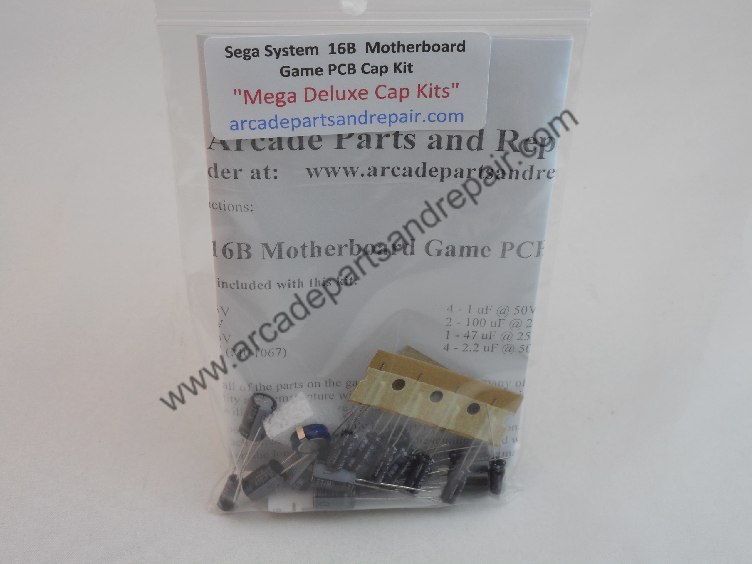 Sega System 16B arcade game PCB Cap Kit 105C Nichicon Capacitors. “Mega Deluxe Cap Kits” Our kits have some of the BEST quality, low ESR, and longest life capacitors included. All of our Cap Kits / Get Well Kits include a sticker so you can place it on the PCB to help you keep track of the work you did and when it was done. This kit has capacitors that have been sized to fit the PCB locations and the kit also includes the Super Capacitor at C35. 21 Capacitors included in kit with great instructions. Here is a list of the System 16B games that this kit should work Alien Syndrome, Dunk Shot, Time Scanner, Bullet, Super League, Sonic Boom, Charon, Altered Beast / Juuouki, Dynamite Dux, Heavyweight Champ, Passing Shot, Sukeban Jansi Ryuko, Tetris, Wonder Boy III: Monster Lair, Ace Attacker, Bay Route, ESWAT, Excite League, Flash Point, Golden Axe, M.V.P., Tough Turf, Wrestle War, Aurail, Ryu Kyu, Atomic Point, Snapper, Cotton, Riot City, Touryuumon.