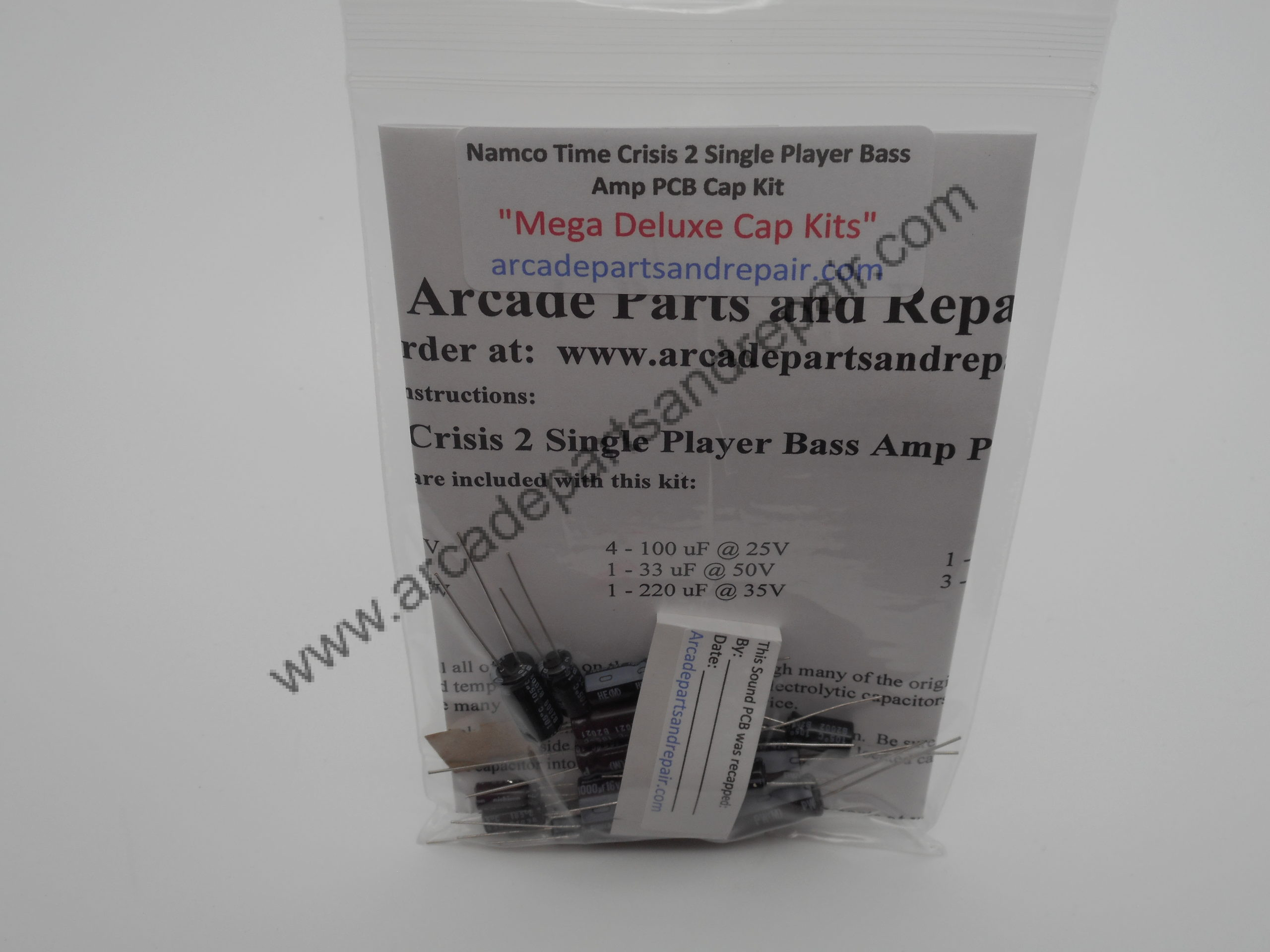 Namco Time Crisis 2 Single Player Sound Bass AMP PCB Cap Kit 105C 100% Nichicon Capacitors.  “Mega Deluxe Cap Kits”  Our kits have some of the BEST quality, low ESR, and longest life capacitors included.  This kit has all the electrolytic capacitors included with proper case size and lead spacing to fit the arcade sound AMP PCB.