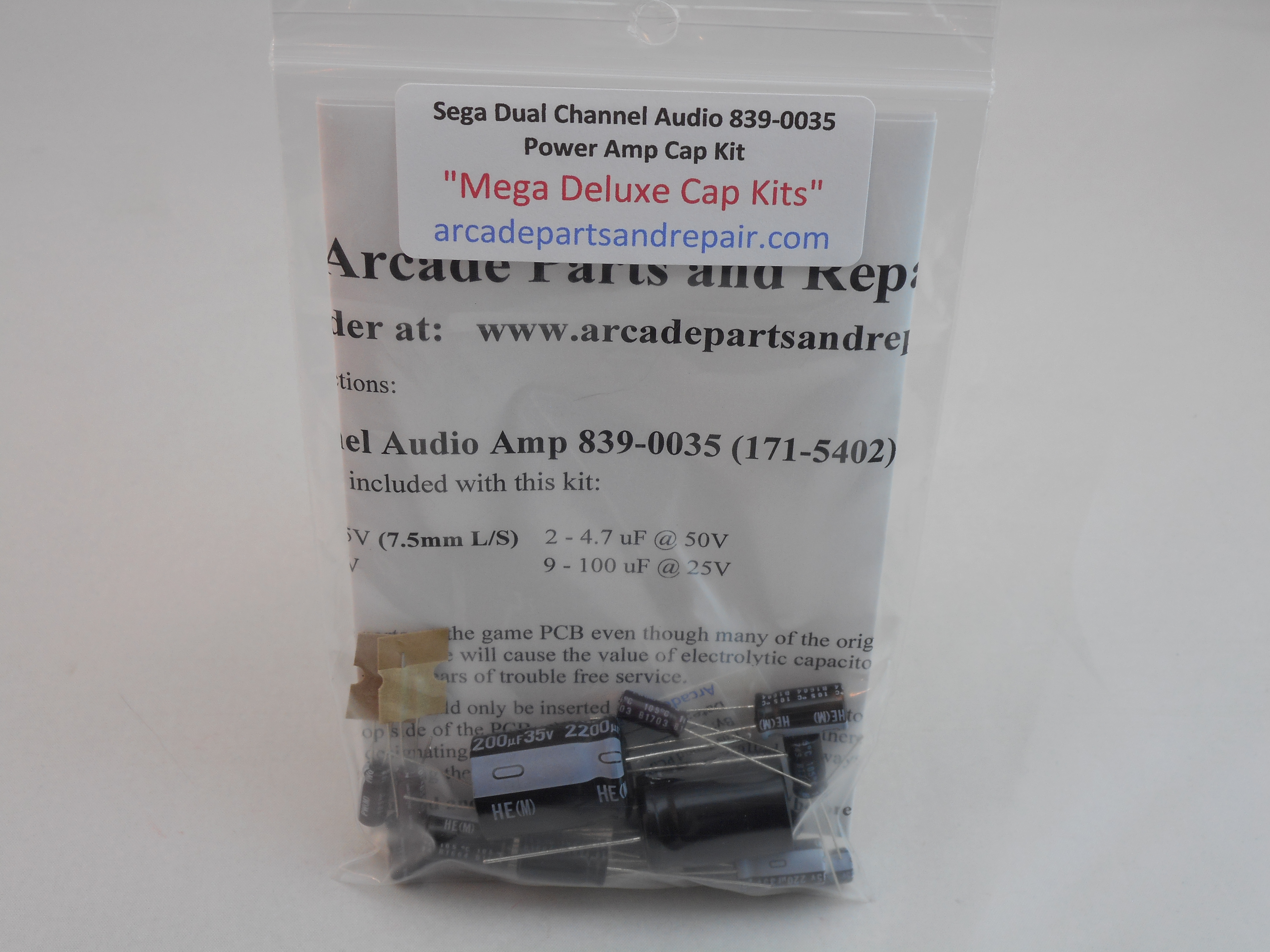 Sega Outrun 839-0035 / 171-5402 Dual Channel Audio Sound AMP PCB Cap Kit 105C 100% Nichicon Capacitors. “Mega Deluxe Cap Kits” Our kits have some of the BEST quality, low ESR, and longest life capacitors included. This kit has all the electrolytic capacitors included with proper case size and lead spacing to fit the arcade sound AMP PCB. This PCB is found in games such as Sega After Burner, Sega Super Hang-On and others. All of our Cap Kits / Get Well Kits include a sticker so you can place it on the PCB to help you keep track of the work you did and when it was done. 19 Capacitors included in kit with great instructions.
