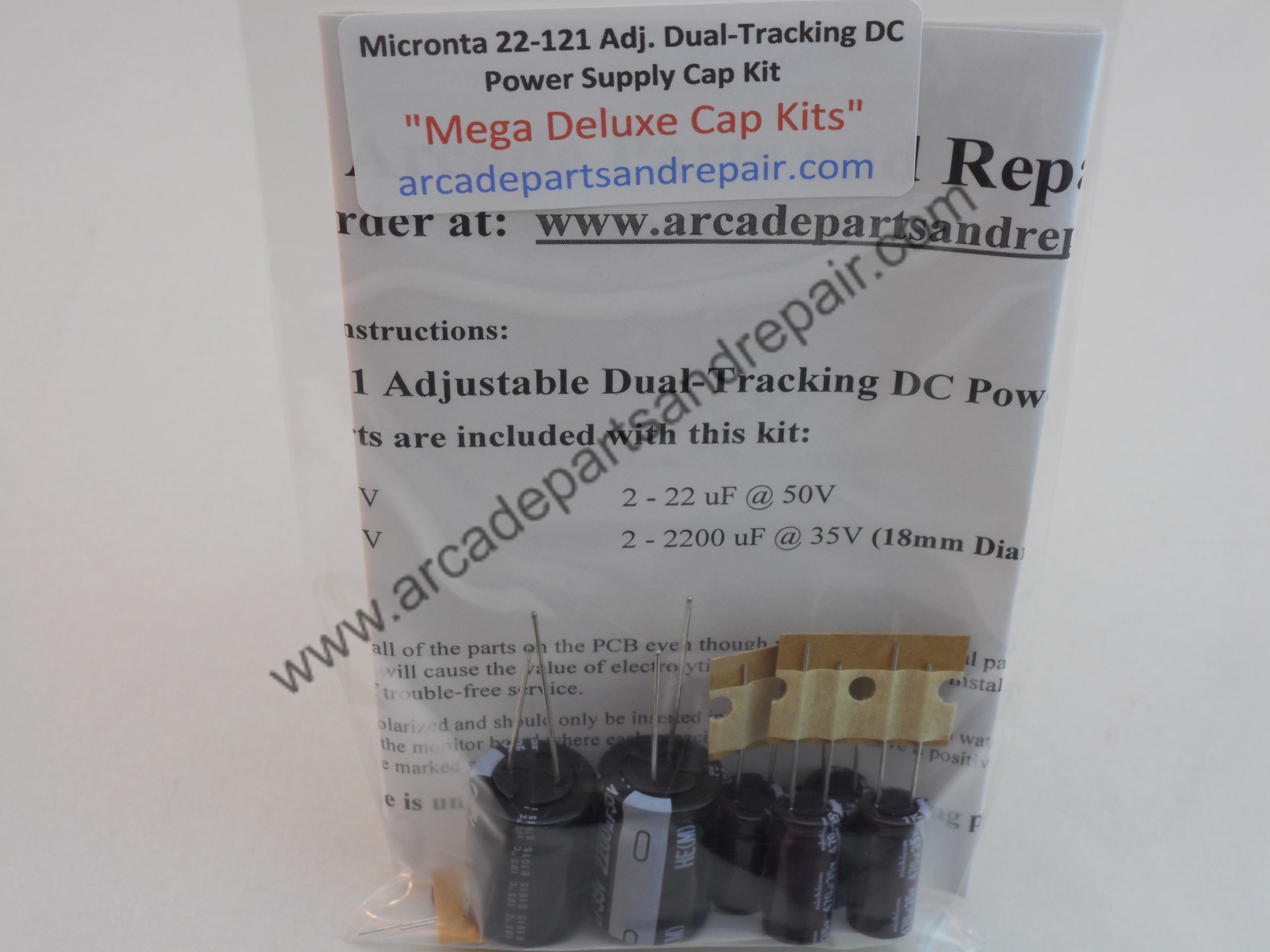 Micronta Model 22-121 Adjustable Dual-Tracking DC Power Supply 105C Nichicon Cap Kit.  This is a common bench test equipment.  This “Mega Deluxe Cap Kit” has a total of 10 Capacitors.  Our kits have some of the BEST quality, low ESR, and longest life capacitors included.