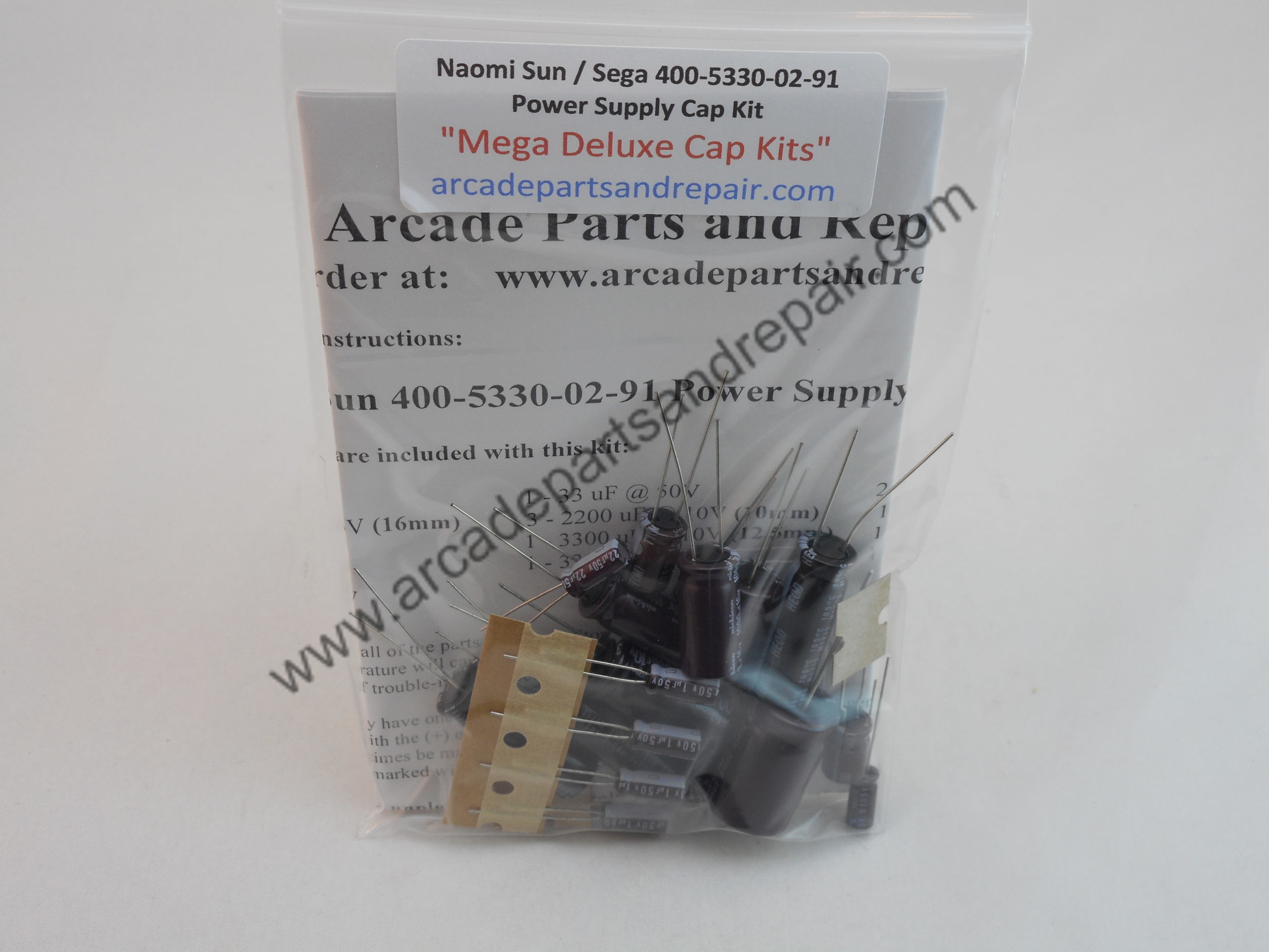 Sega Naomi Sun Electronics Arcade Power Supply Unit Model 400-5330-02-91 Cap Kit 105C 100% Nichicon Capacitors and has the PCB labels of MP-18001C. “Mega Deluxe Cap Kits” Our kits have some of the BEST quality, low ESR, and longest life capacitors included. This kit has all the electrolytic capacitors included with proper case size and lead spacing to fit the arcade power supply PCB. You won’t find a kit out there that has such attention to details on the case sizes and lead spacing along with such high hour and high quality caps as our kits. All of our Cap Kits / Get Well Kits include a sticker so you can place it on the PCB to help you keep track of the work you did and when it was done. 19 Capacitors included in kit with great instructions. NOTE: Filter caps for this Power Supply are two 680uf 200v and they are not included in the kit but can be purchased separately on our site and requires the special case size we stock 25mm diameter so it will fit the PCB.