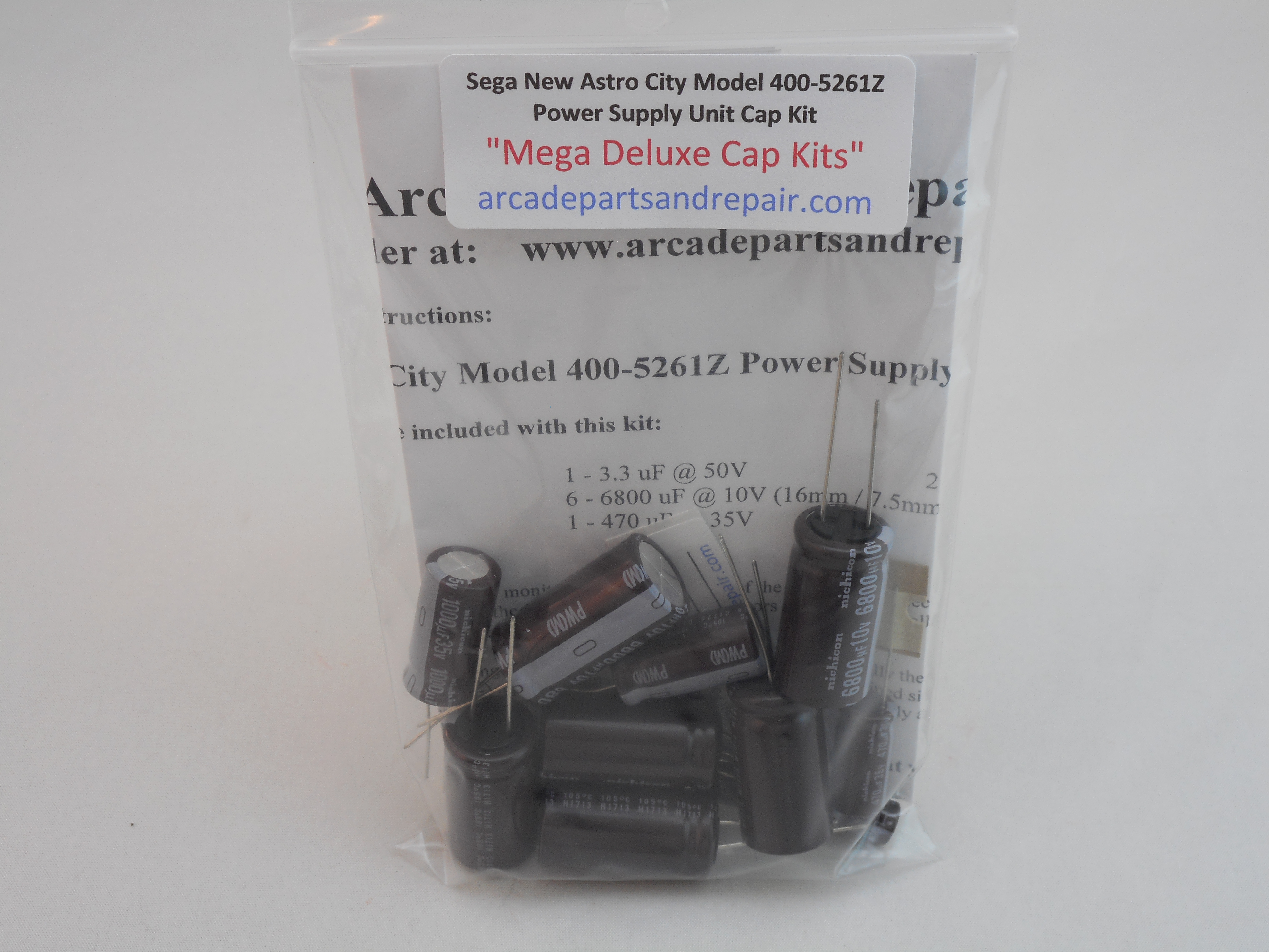 Sega New Astro City Model 400-5261Z & Model 400-5261Y & Model 400-5261 arcade Power Supply PCB Cap Kit 105C 100% Nichicon Capacitors.  “Mega Deluxe Cap Kits”  Our kits have some of the BEST quality, low ESR, and longest life capacitors included.  This kit has all the electrolytic capacitors included with proper case size and lead spacing to fit the arcade power supply PCB.  You won’t find a kit out there that has such attention to details on the case sizes and lead spacing along with such high hour and high quality caps as our kits.  All of our Cap Kits / Get Well Kits include a sticker so you can place it on the PCB to help you keep track of the work you did and when it was done.   13 Capacitors included in kit with great instructions.  NOTE: Filter cap for this Power Supply is a 470uf 250v and is not included in kit but can be purchased separately on our site and requires the special 25mm x 40mm case sized we stock so it will fit the PCB Click Here to be directed to it.