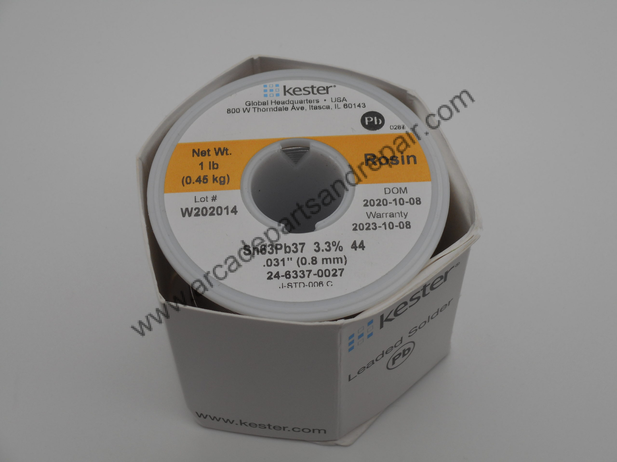 Kester 44 Rosin Core 63/37 1LB (One Pound) Spool Solder, 0.031 diameter (MP1075). These rolls are new fresh solder from Kester and will give you the best results for soldering arcade and pinball PCBs. This solder is leaded like the original used on games so make sure to use it with proper ventilation.